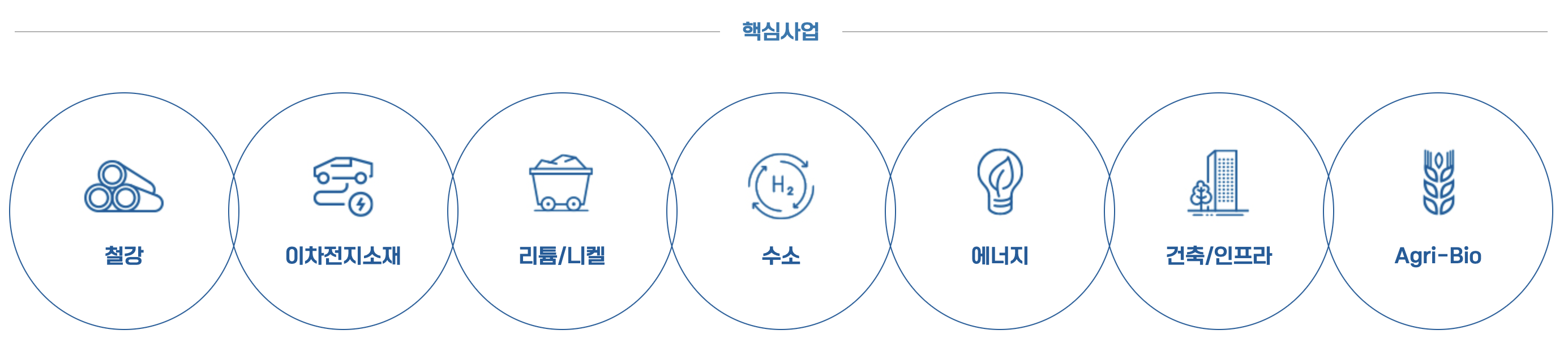 제선, 제강 및 압연재의 생산과 판매를 주요 사업으로 영위하고 있으며 그룹 전반의 성장 전략을 수립하고 미래 사업 테마를 발굴하며 M&A 등 신사업을 추진하는 미래사업 포트폴리오 개발자 역할을 수행하고 있습니다.