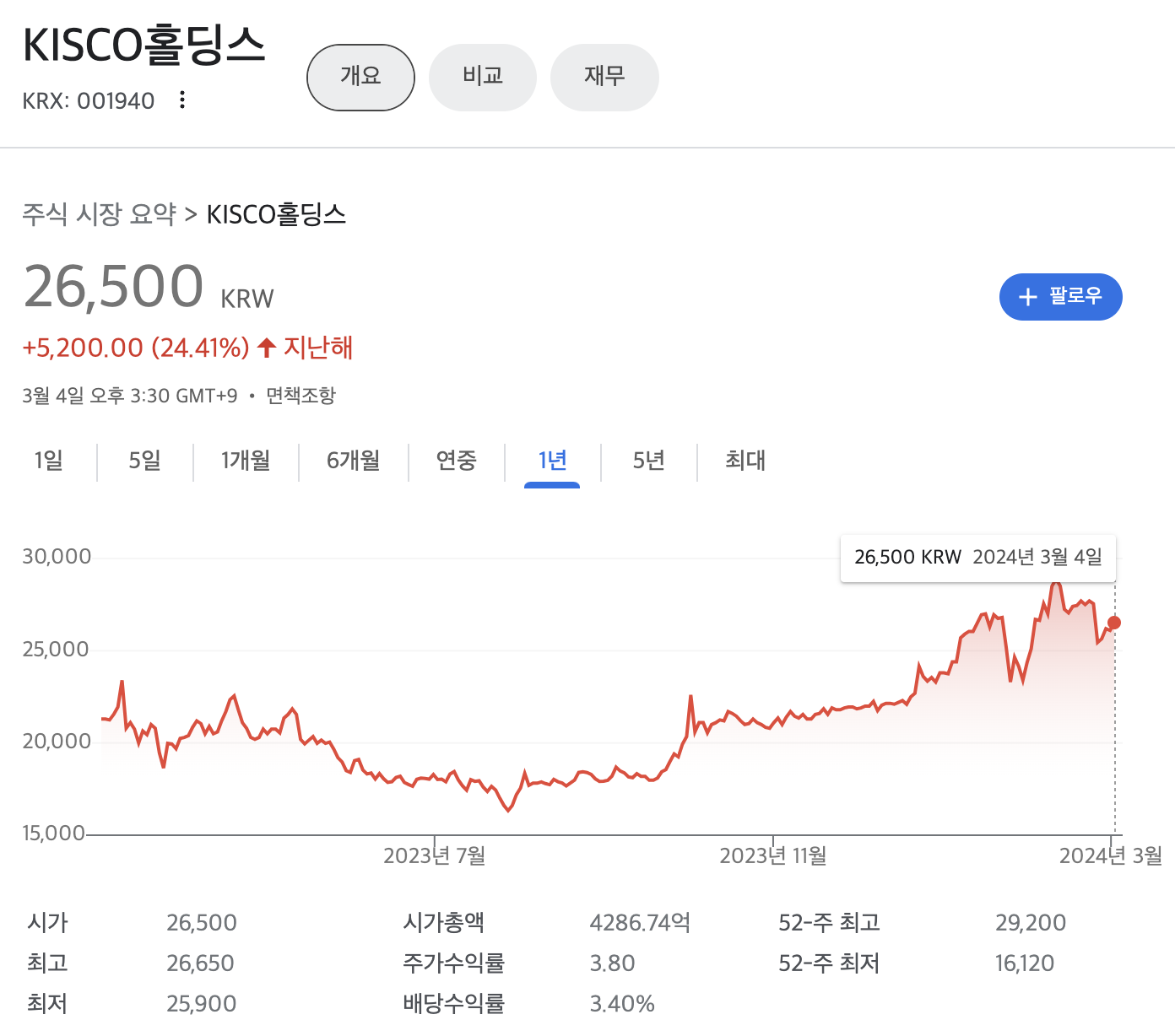 KISCO홀딩스 주가는 지난해 1년대비 24.41% 상승해 있는 상태 입니다.