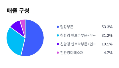 POSCO홀딩스는 철강부문 53.3%, 친환경 인프라부문 31.2%, 친환경 인프라부문 10.1%, 친환경미래소재 4.7%의 매출 구성으로 되어 있습니다. 친환경 기업으로 변화한 것이 매출구성에서 보입니다.