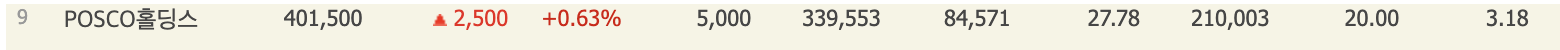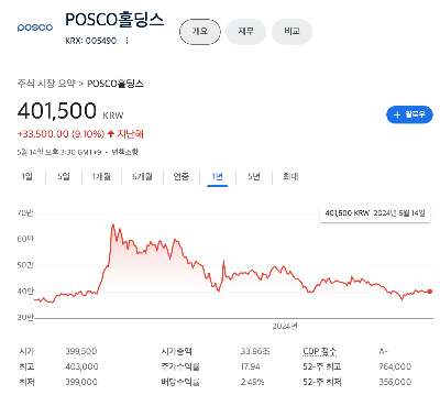 POSCO홀딩스 주가는 지난해 1년 대비 9.10% 상승해 있습니다.