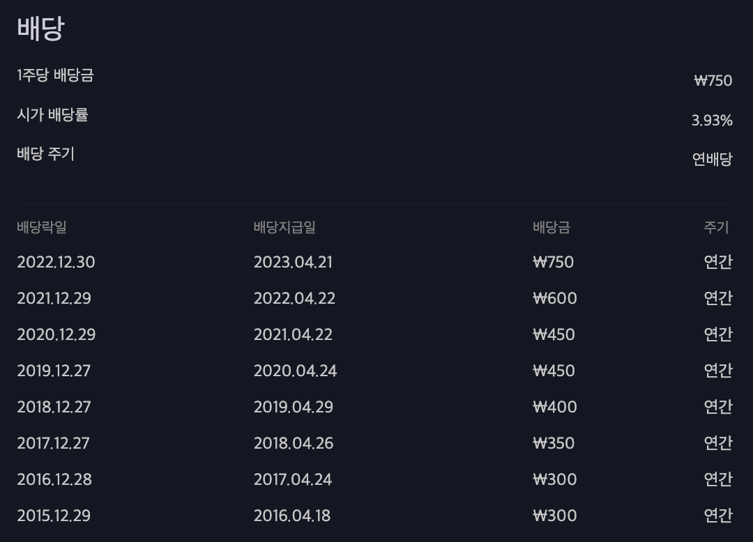 2016년 배당을 시작으로 꾸준한 배당을 해오고 있습니다.