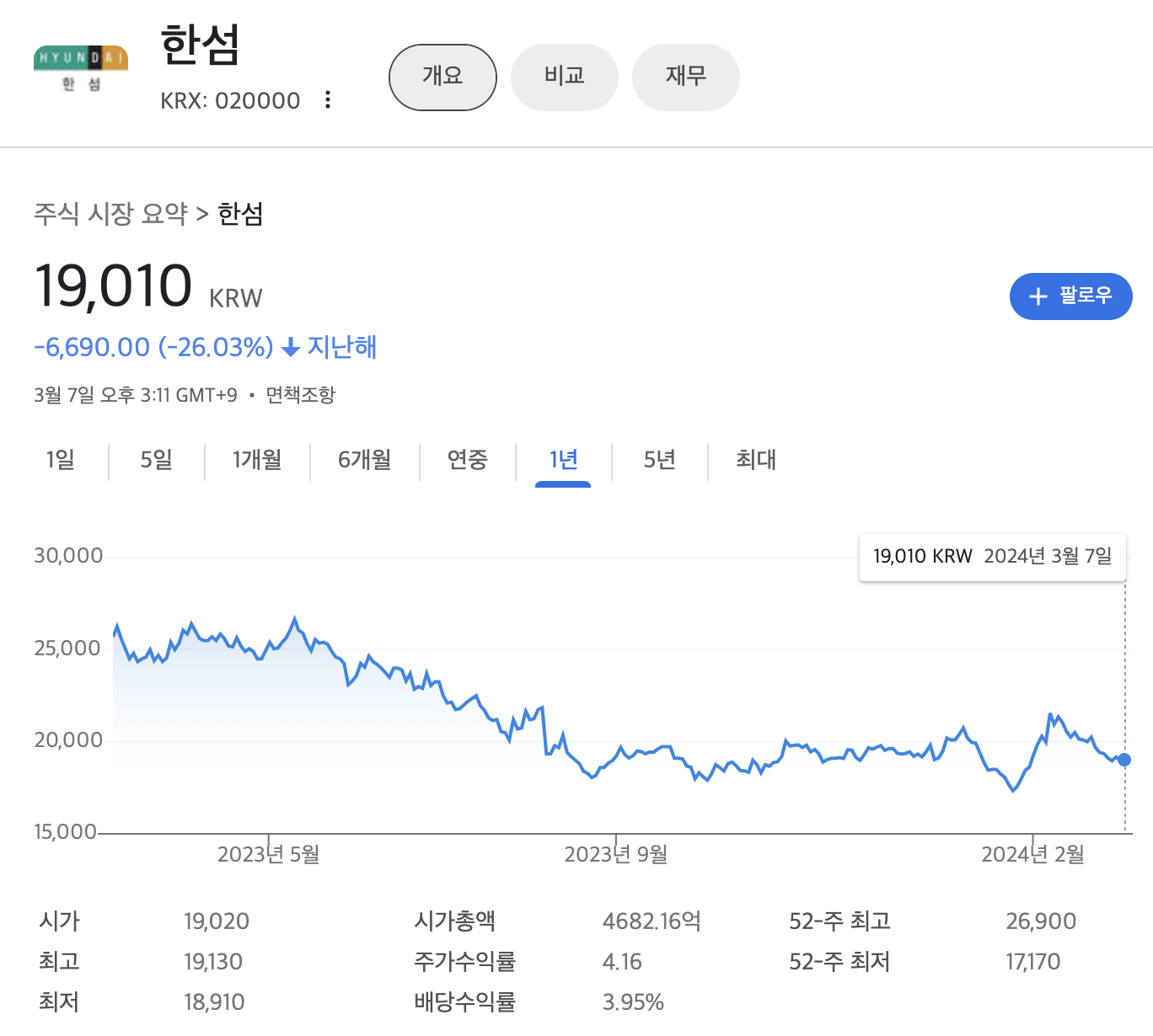 한섬(020000) 주가 및 뉴스 - Google Finance