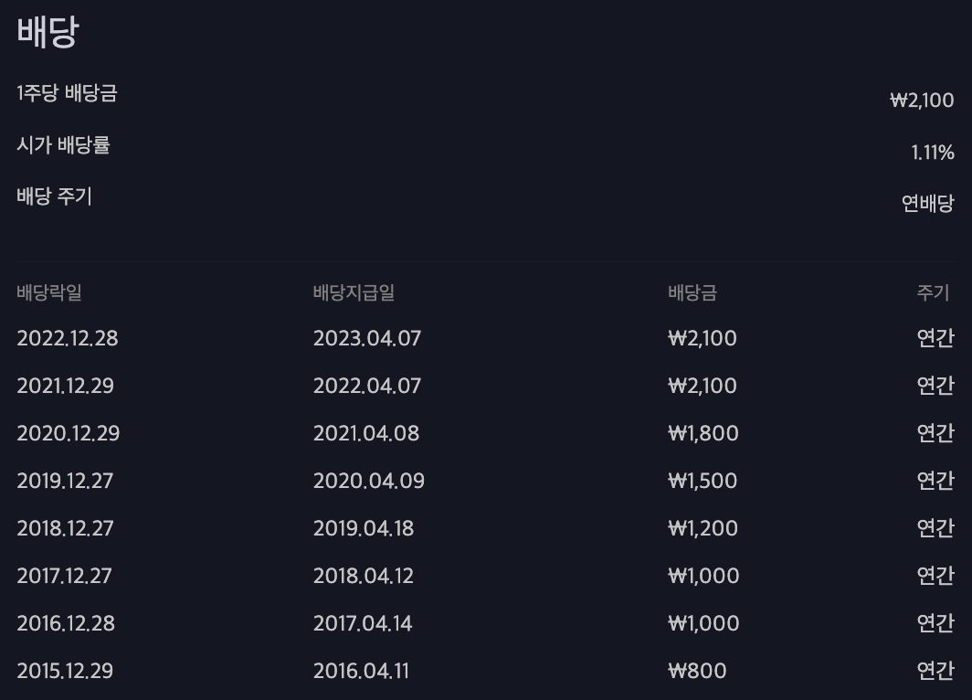 2016년이후 배당금은 꾸준히 증가하고 있는 기업 입니다.