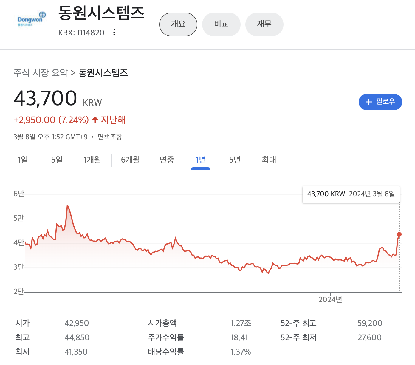 동원시스템즈 주가(2024년 3월기준)