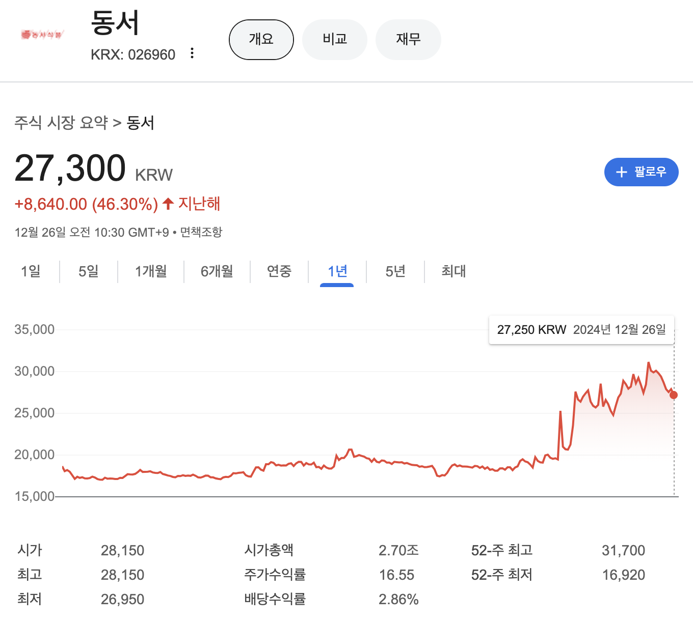 동서 주가는 지난해 1년대비 46.30% 상승해 있는 상태 입니다.