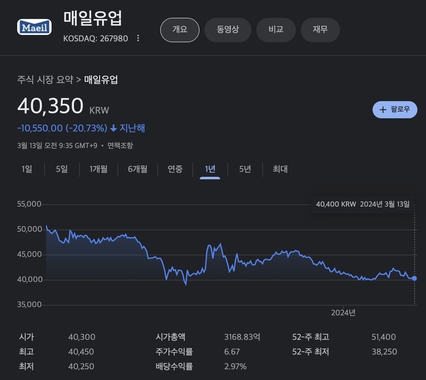 매일유업 주가(2024년 3월기준)