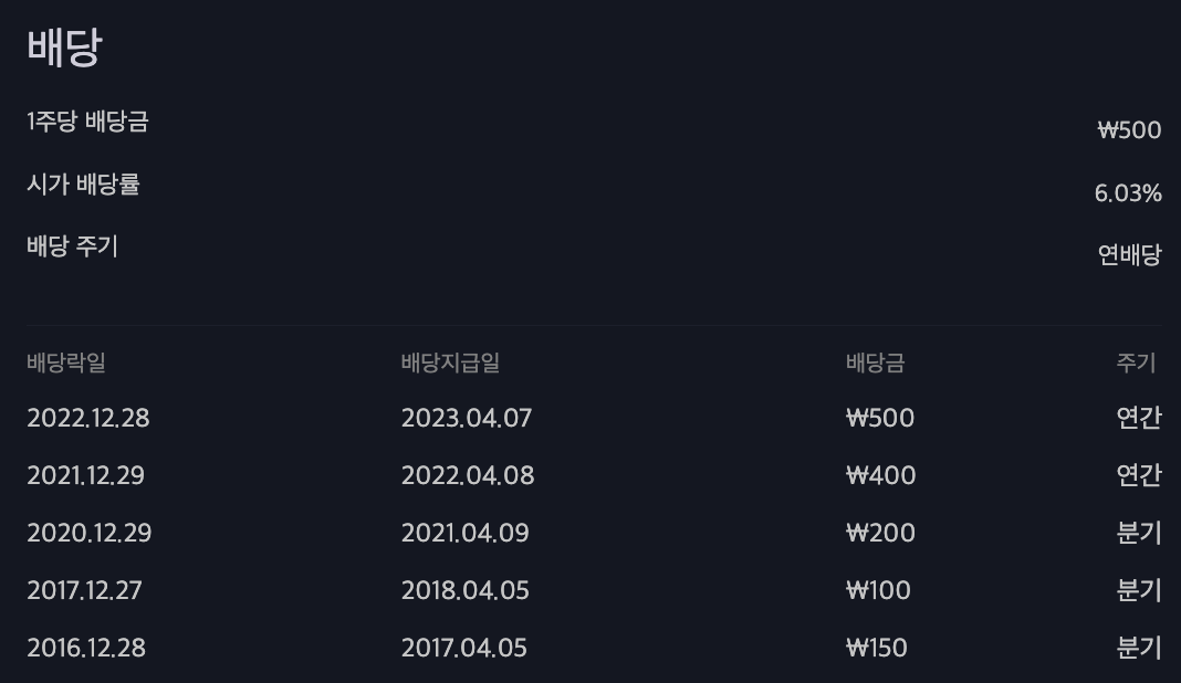 동국홀딩스는 2017년도부터 분기배당으로 시작을 했으나 2022년부터는 연간으로 배당을 하고 있습니다.