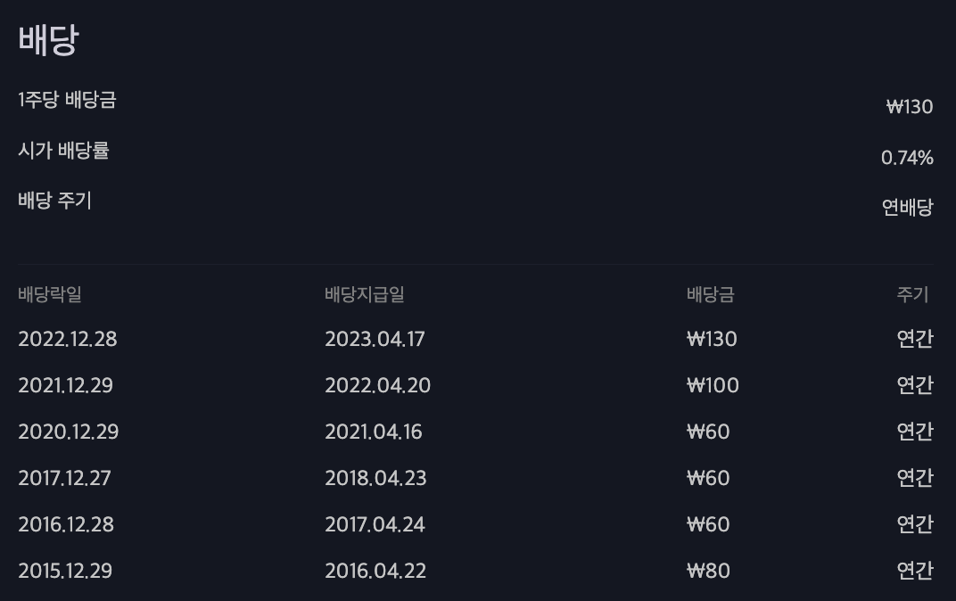 2019, 2020년도는 배당을 하지 않았으며 2022년부터 다시 연간 배당을 실시 하였습니다.