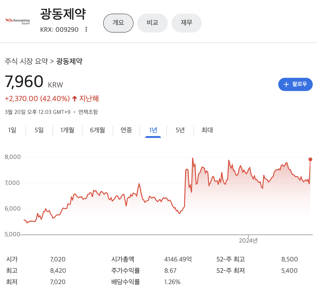 광동제약 주가(2024년 3월기준)