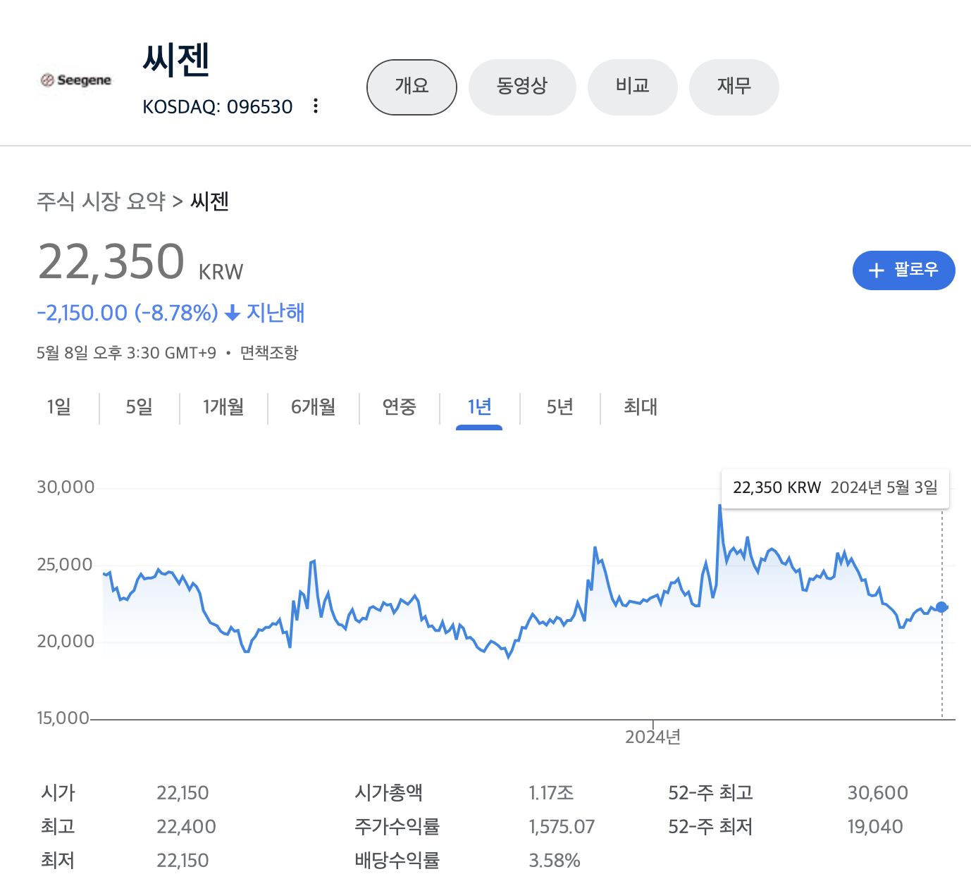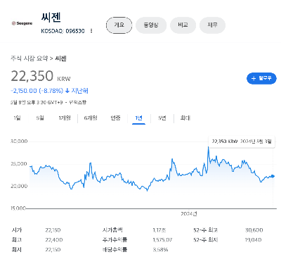 씨젠 주가는 지난해 1년대비 -8.78% 하락해 있는 상태 입니다.