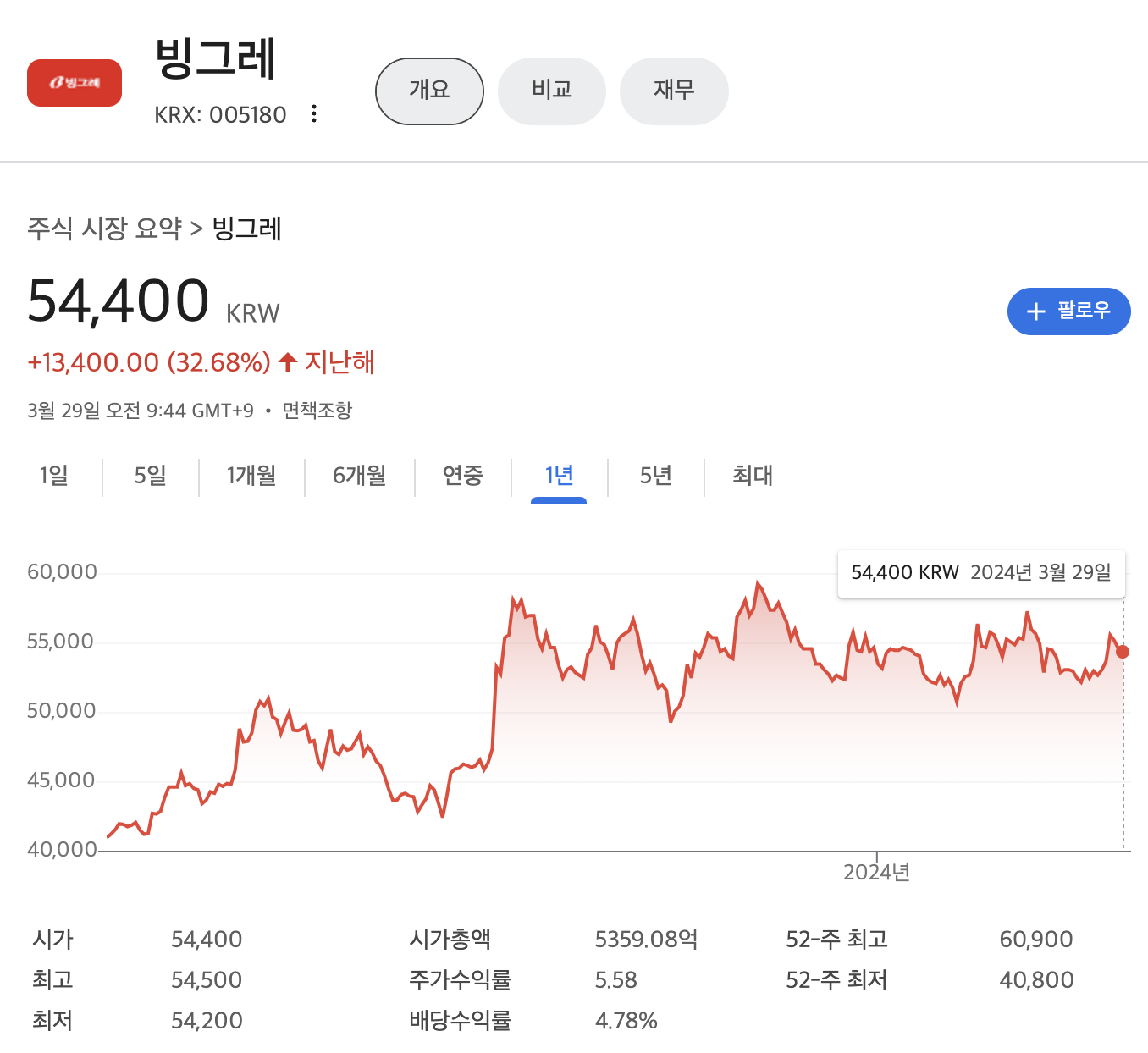 최근 빙그레(005180)의 실시간 시세, 이전 실적, 차트를 비롯한 금융 정보를 확인하여 충분한 정보를 바탕으로 주식 거래와 투자를 결정하세요.