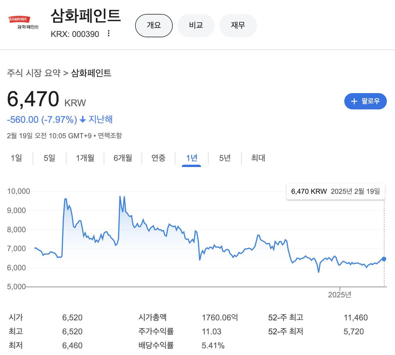 삼화페인트 주가는 지난해 1년대비 -7.97% 하락해 있는 상태 입니다.