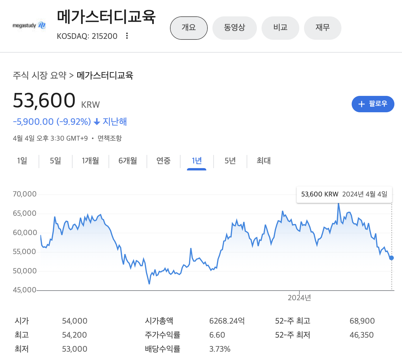 메가스터디교육 주가는 지난해 1년대비 -9.92% 하락해 있는 상태 입니다.