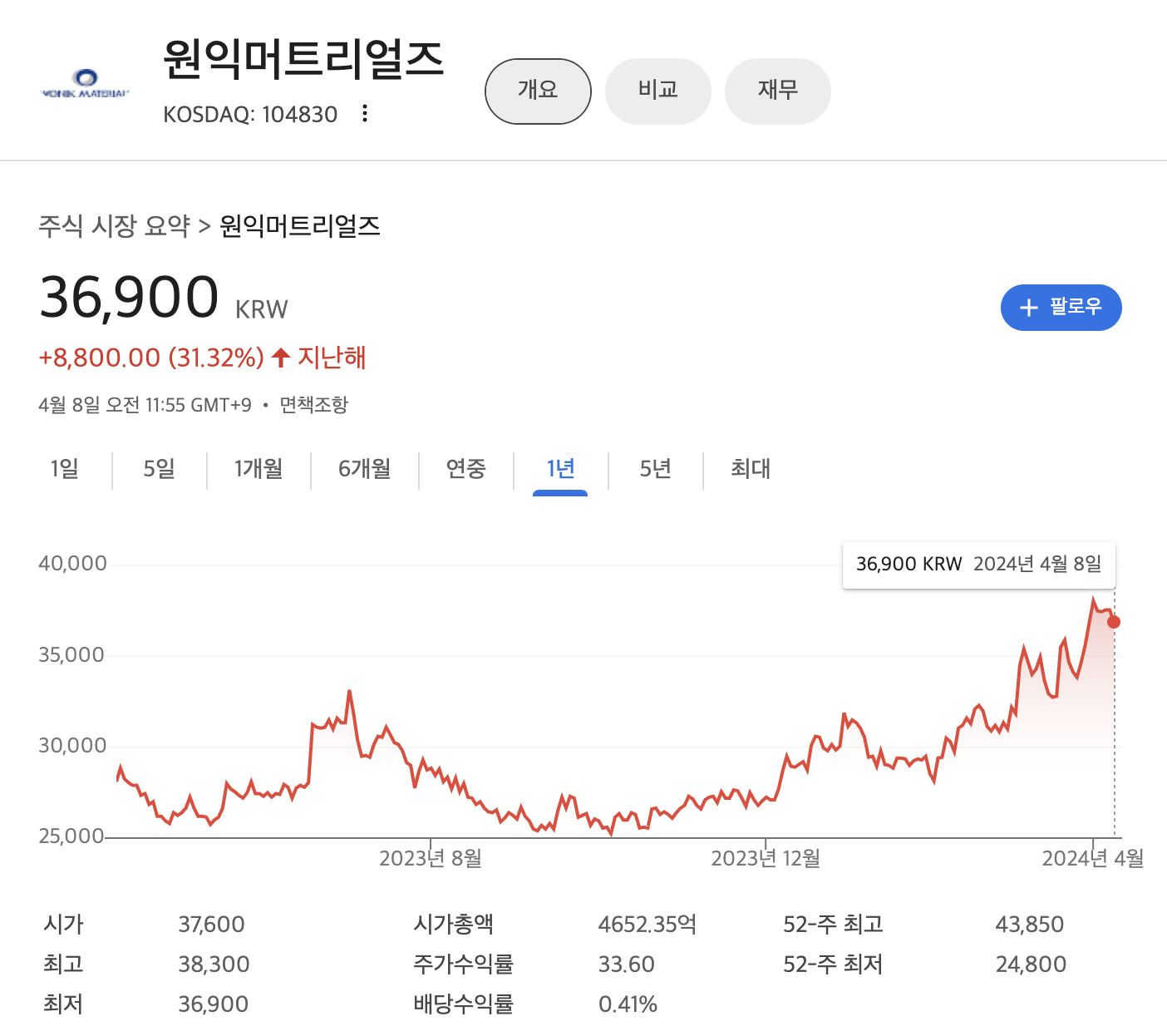 원익머트리얼즈 주가는 지난해 1년대비 31.32% 상승해 있는 상태 입니다.