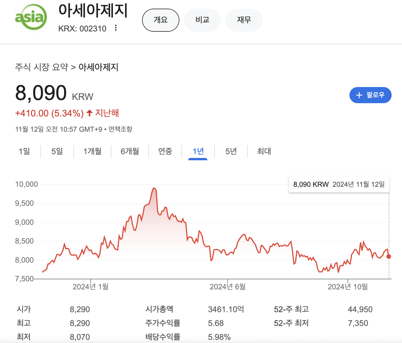아세아제지 주가는 지난해 1년대비 5.34% 상승해 있는 상태입니다.