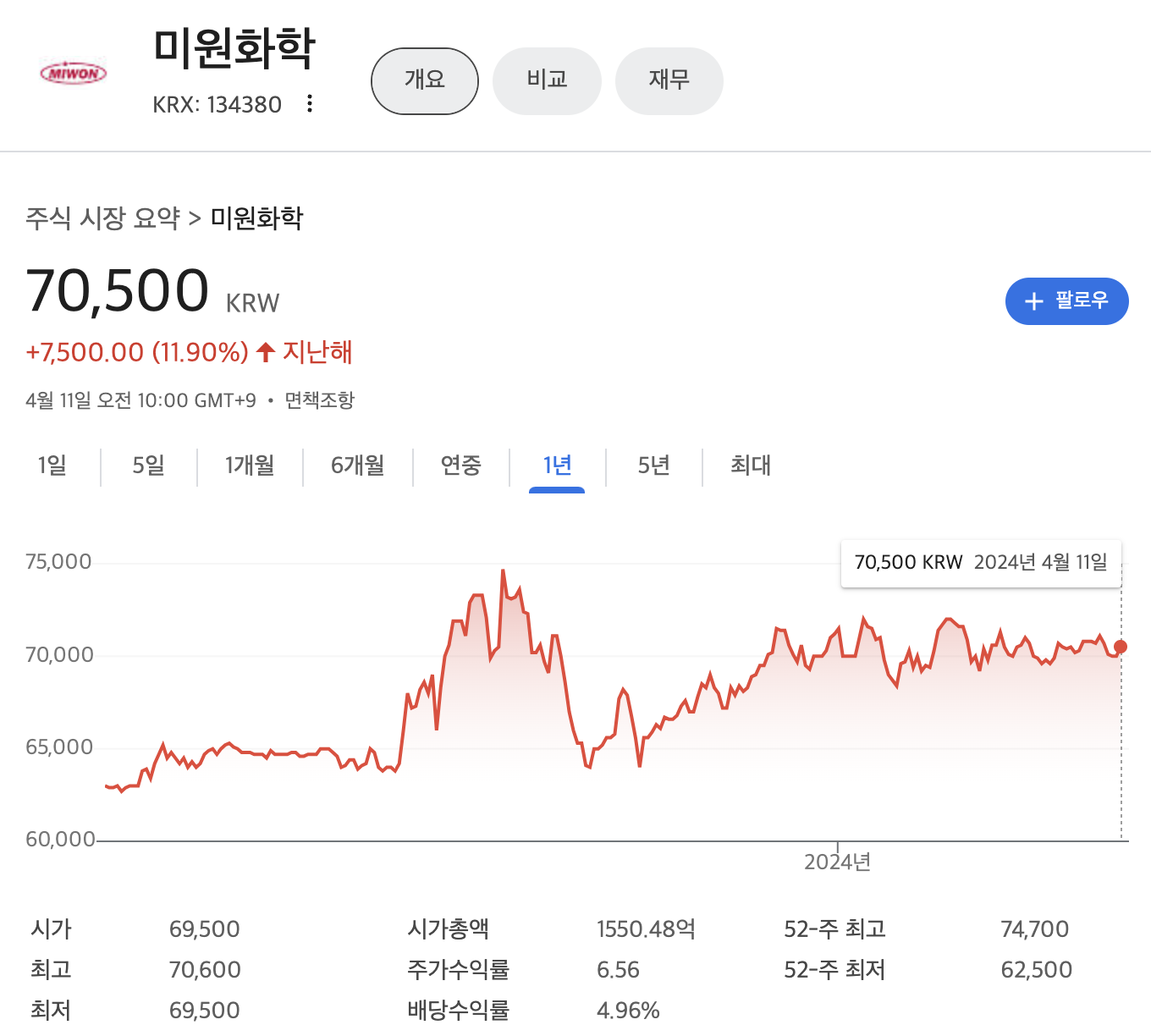 미원화학 주가는 지난해 1년대비 11.90% 상승해 있는 상태 입니다.