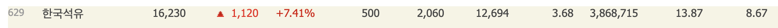 한국석유는 코스피에 상장되어 있으며 시가총액 629위의 기업입니다.(2024년 4월기준)