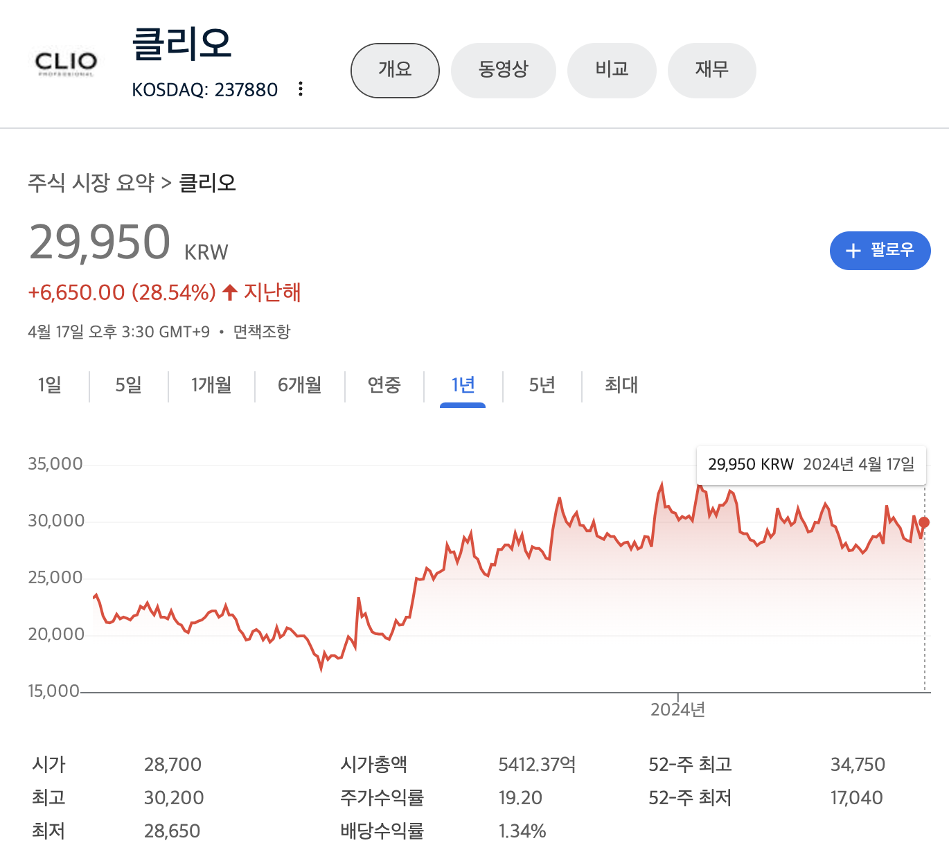 클리오 주가는 지난해 1년대비 28.54% 상승해 있는 상태 입니다.