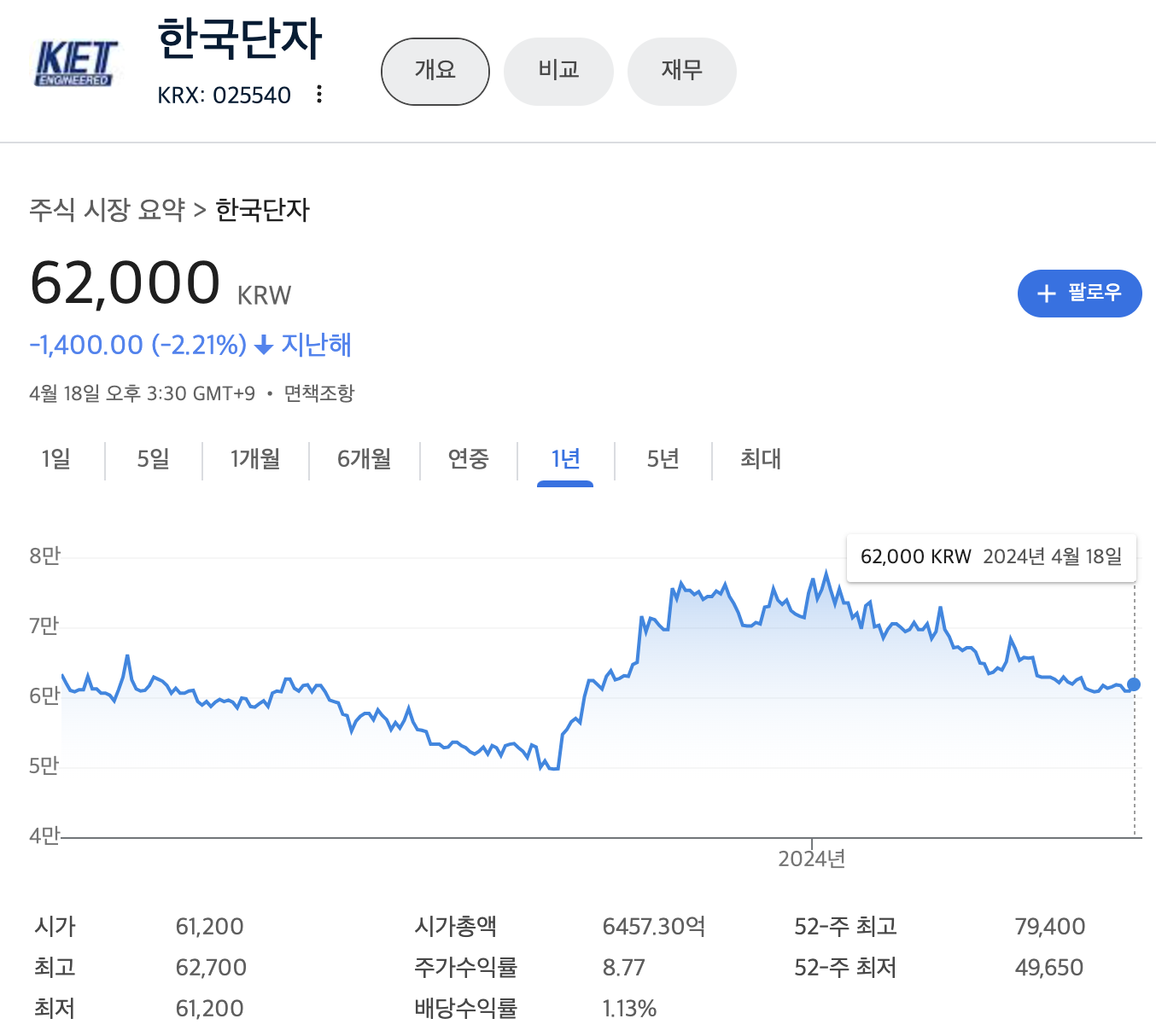 최근 한국단자(025540)의 실시간 시세, 이전 실적, 차트를 비롯한 금융 정보를 확인하여 충분한 정보를 바탕으로 주식 거래와 투자를 결정하세요.