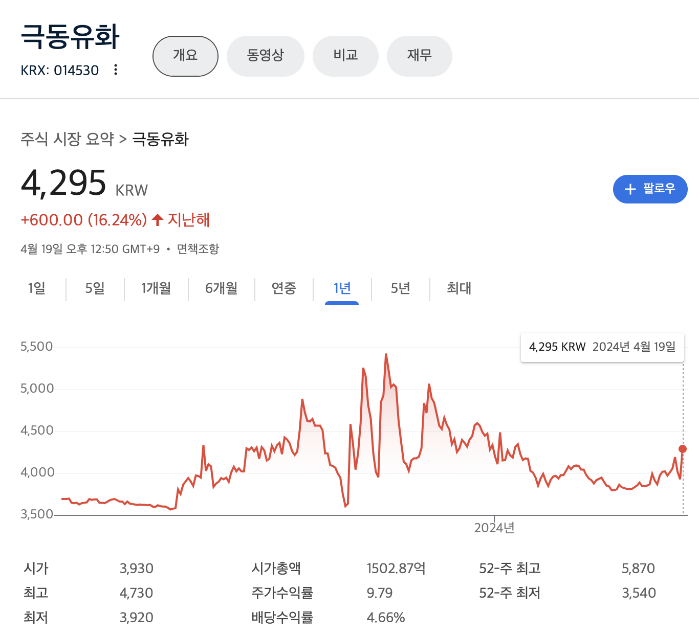 52주 최고 5,870원이었으며 52주 최저 3,540원이었습니다.