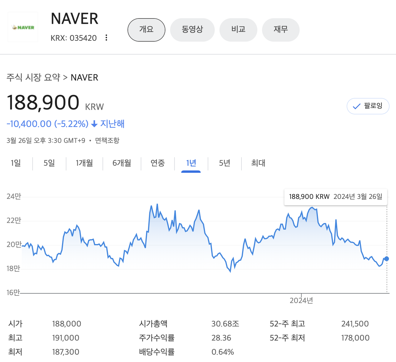네이버 주가는 지난해 1년기준 -5.22% 하락해 있는 상태입니다.