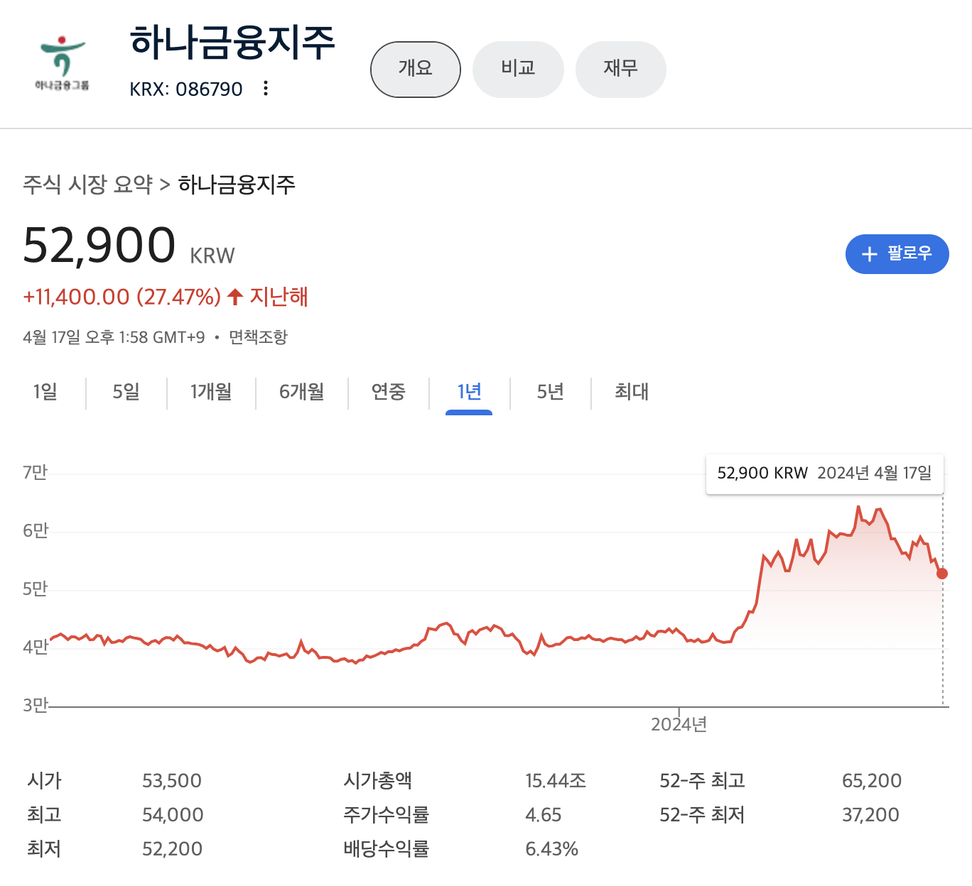 하나금융지주(086790) 주가 및 뉴스 - Google Finance