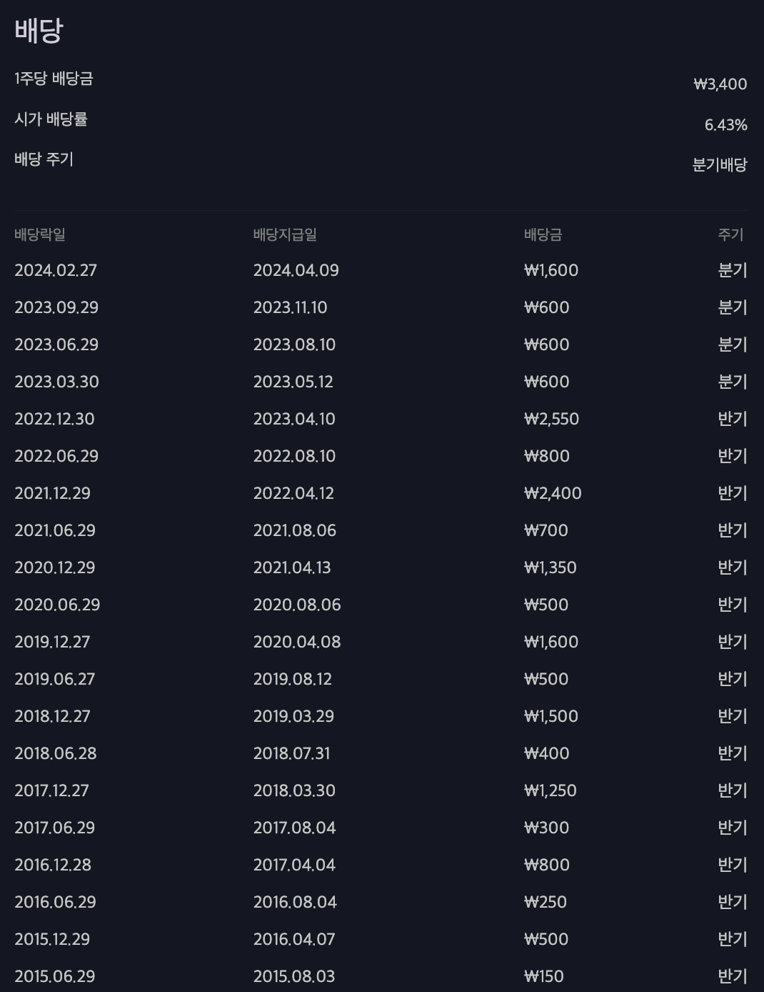 그러다 2023년 부터 분기배당을 실시하고 있습니다.