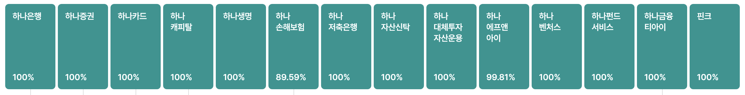 그 외에도 하나생명, 하나 손해보험, 하나 저축은행, 하나 자산신탁, 하나 대체투자 자산운용, 하나 에프엔아이, 하나벤처스, 하나펀스 서비스, 하나금융티아이, 핀크 등이 있습니다.