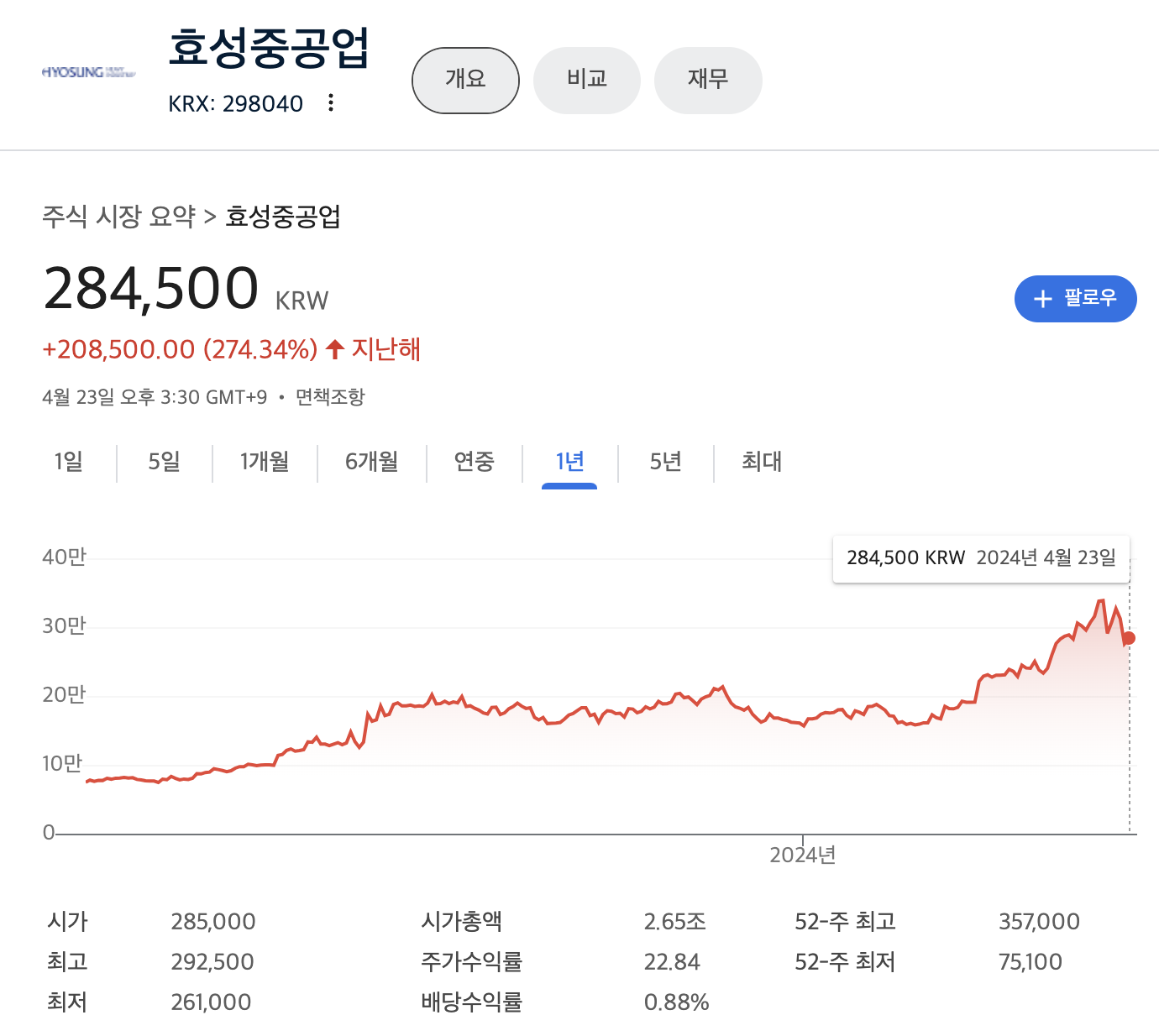 효성중공업 주가는 지난해 1년대비 274.34% 상승해 있는 상태 입니다.