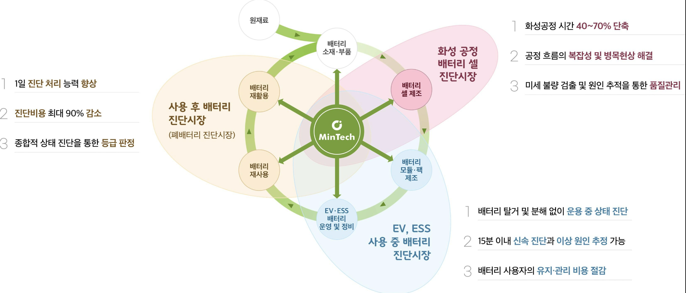 민테크의 주요 목표시장인 이차전지 검사, 진단 산업은 전방 산업인 이차전지 산업의 빠른 성장과 함께 전기자동차와 ESS의 보급이 크게 늘어나면서 배터리 제조, 사용중, 사용후에 걸친 배터리 생애 전주기에 대한 검사 수요와 진단 요구가 급격히 증가하고 있는 향후 가파른 성장이 기대되는 시장으로 평가받고 있습니다.