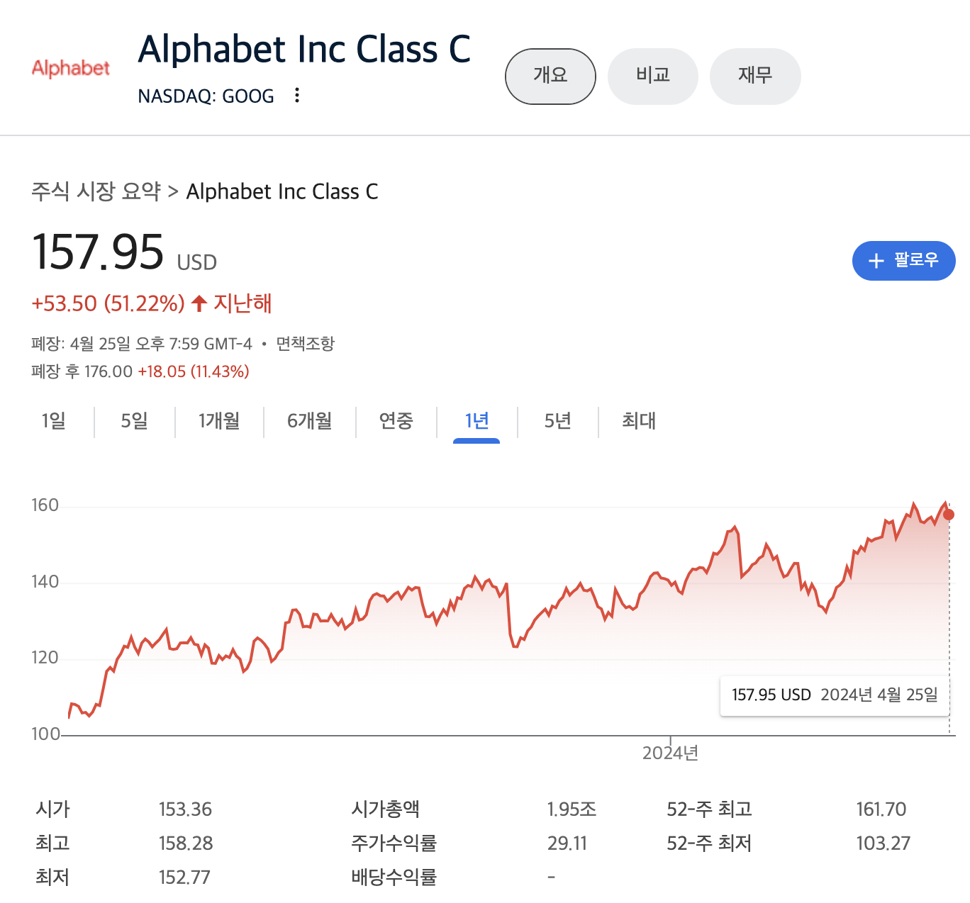 알파벳(구글) 주가는 지난해 1년대비 51.22% 상승해 있는 상태 입니다.