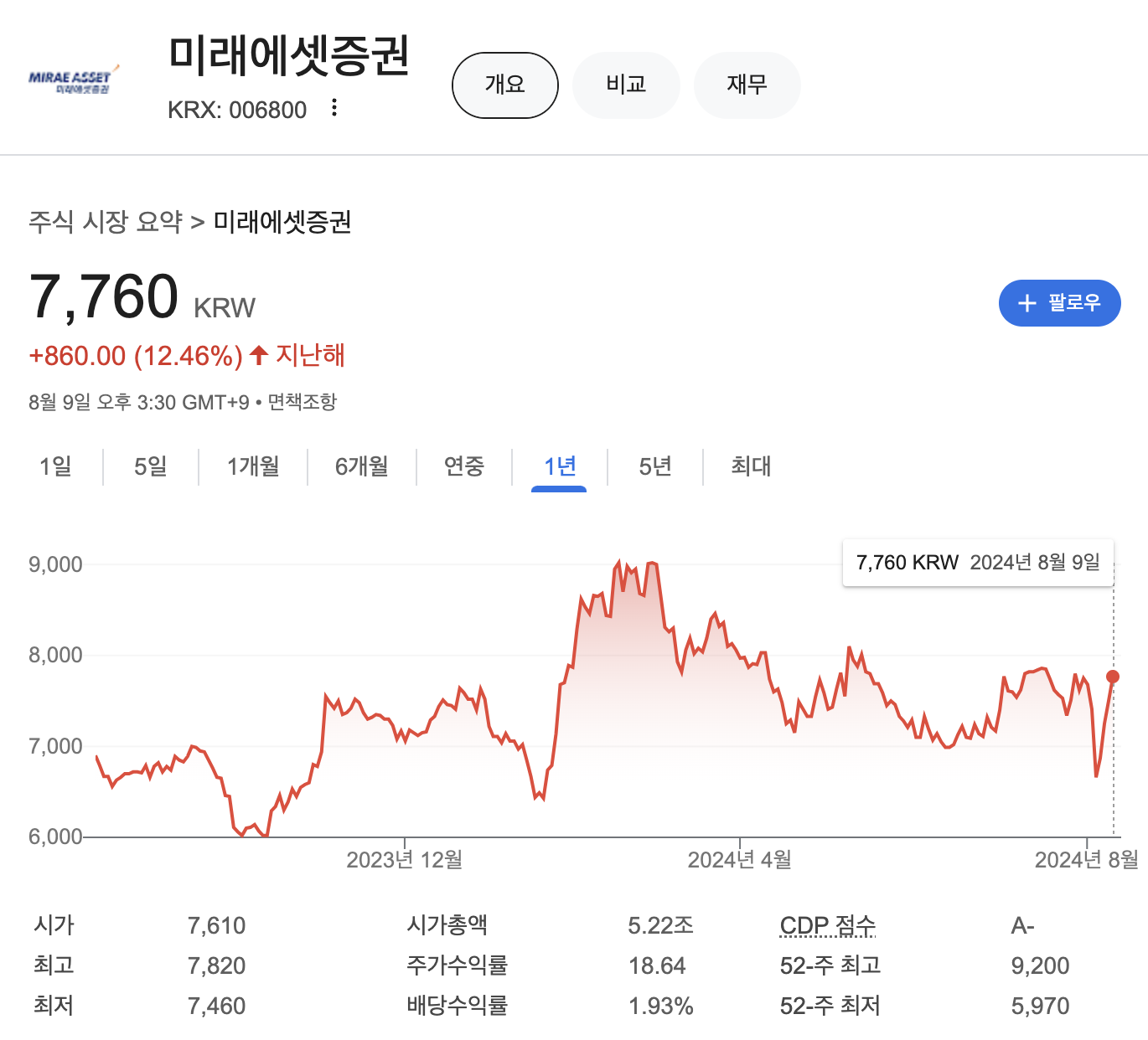 미래에셋증권 주가는 지난해 1년대비 12.46% 상승해 있는 상태 입니다.