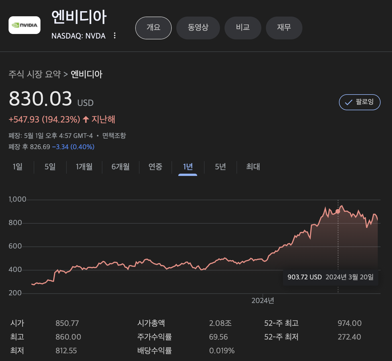 그러나 지난해 1년대비 엔비디아의 주가는 193.23%로 상승해 있는 상태 입니다.