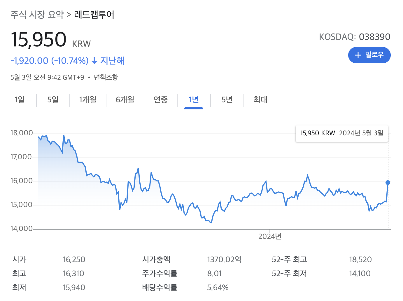 레드캡투어 주가는 지난해 1년대비 10.74% 하락해 있는 상태 입니다.