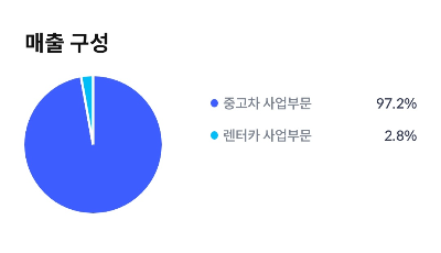 케이카는 중고차 사업부문 97.2%, 렌터카 사업부문 2.8%의 매출구성을 하고 있습니다.