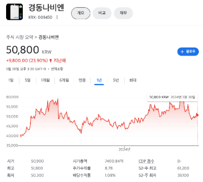 경동나비엔은 지난해 1년대비 23.90% 상승해 있습니다.