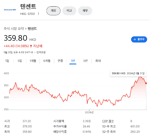텐센트는 지난해 1년대비 주가가 14.08% 상승해 있는 상태 입니다.