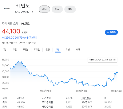 HL만도는 지난해 1년대비 -8.79% 하락해 있는 상태 입니다.