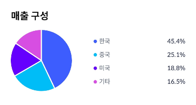 한국 45.4%, 중국 25.1%, 미국 18.8%, 기타 16.5%의 매출 구성으로 이루어져 있습니다.