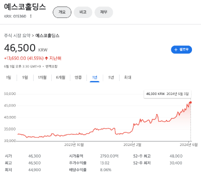 예스코홀딩스는 지난해 1년대비 41.55% 상승해 있는 상태 입니다.