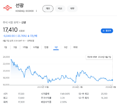 선광의 주가는 지난해 1년 대비 -25.76% 하락해 있는 상태입니다.