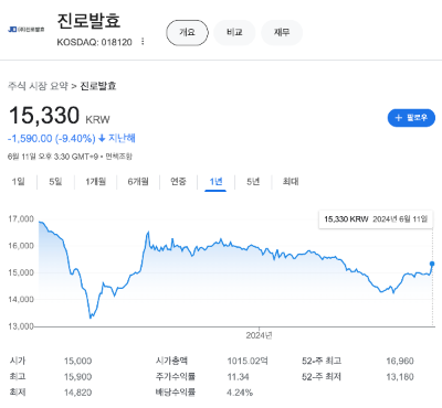 진로발효는 지난해 1년대비 -9.40% 하락해 있는 상태 입니다.