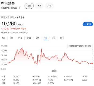 한국알콜은 지난해 1년대비 1.08% 상승해 있는 상태입니다.