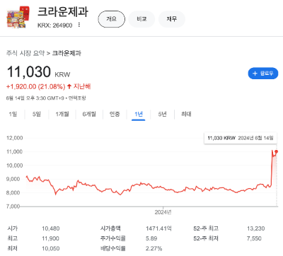 크라운제과의 주가는 지난해 1년대비 21.08% 상승해 있는 상태입니다.