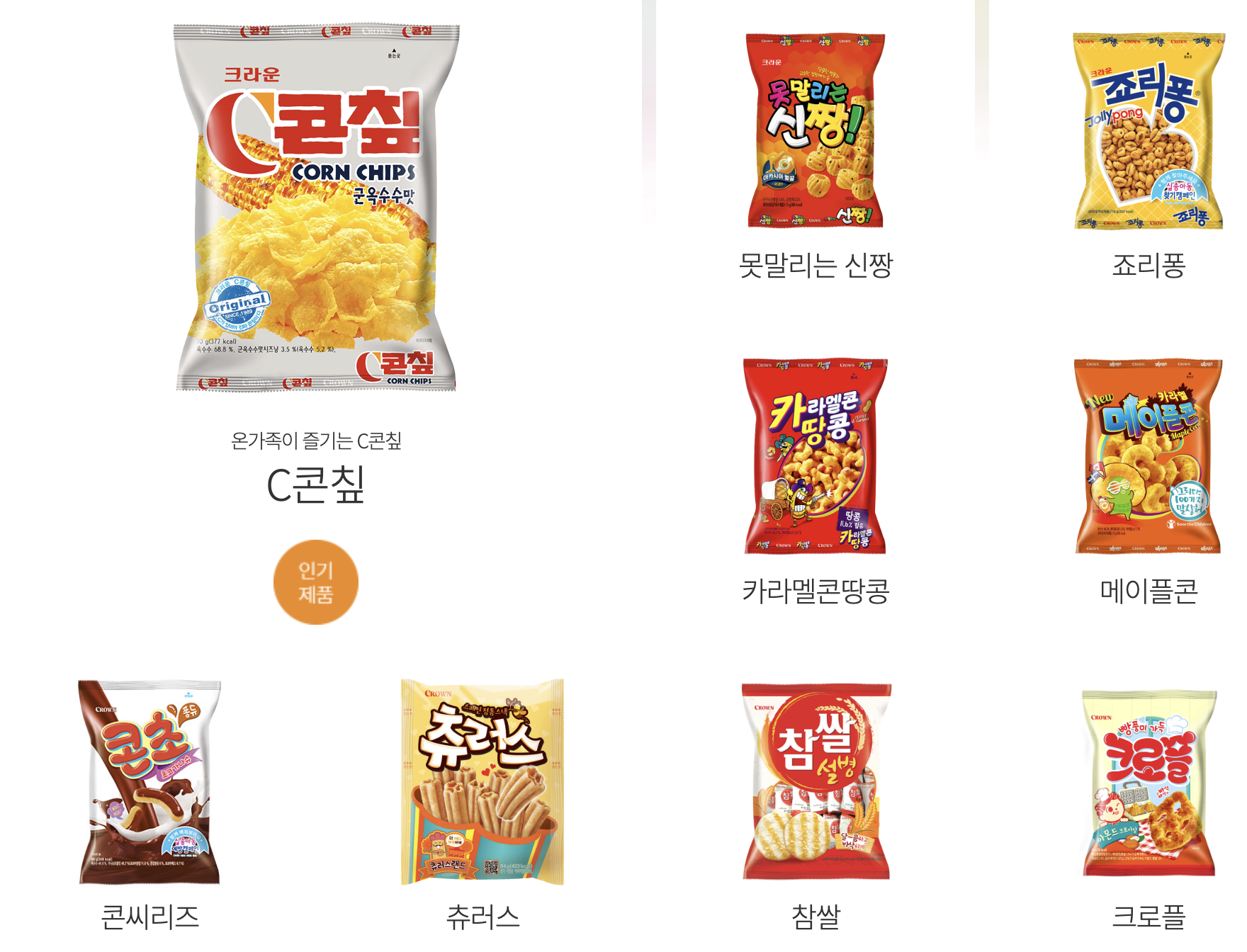 크라운제과의 인기 제품들은 다음과 같습니다.