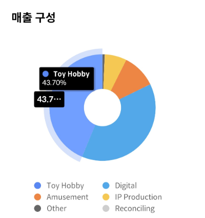 반다이 남코 홀딩스는 Toy Hobby 43.70%, Digital 38.50%, Amusement 10.42%, IP Production 6.70%, Other의 매출 구성을 하고 있습니다. 매출 구성의 50%의 가까운 것은 Toy Hobby 43.70%입니다.