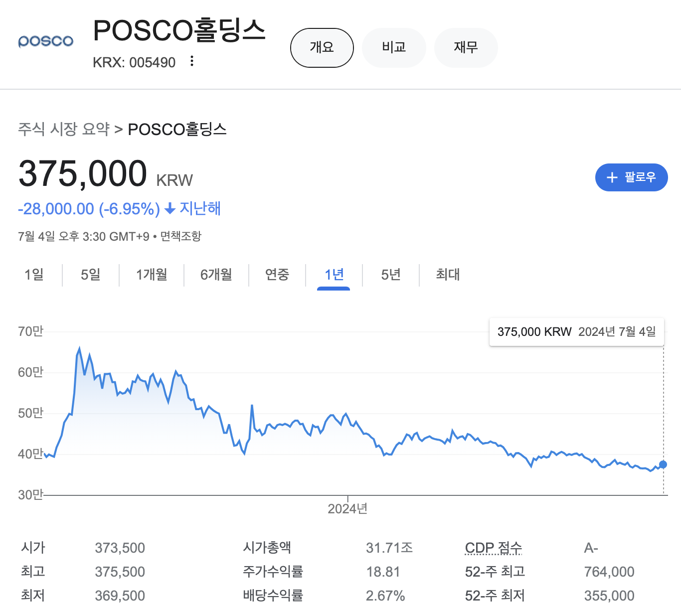 2024년 7월5일 장마감 기준으로 POSCO홀딩스 주가는 375,000원입니다. 지난해 7월 기록한 65만8,000원의 고점과 비교해 볼 때 시가총액 규모 대비 상당한 하락세라고 할 수 있습니다. 전문가들의 POSCO홀딩스 평균 목표주가는 62만 5750원으로 현재 주가 대비 약 50%이상의 상승 여력이 있는 것으로 예상하고 있습니다.