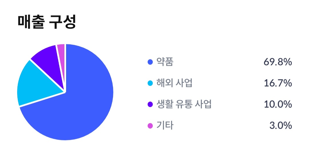 안국약품은 약품 69.8%, 해외 사업 16.7%, 생활 유통 사업 10.0%, 기타 3.0%의 매출 구성을 하고 있습니다. 매출 구성의 50%이상이 약품 69.8%입니다. ( 더 자세히 살펴보면 순환기용제가 38.25%, 호흡기용제가 25.13%, 소화기계용제가 11.67%, 해열진통제가 3.87% 그리고 기타가 21.08%를 차지하고 있습니다. )