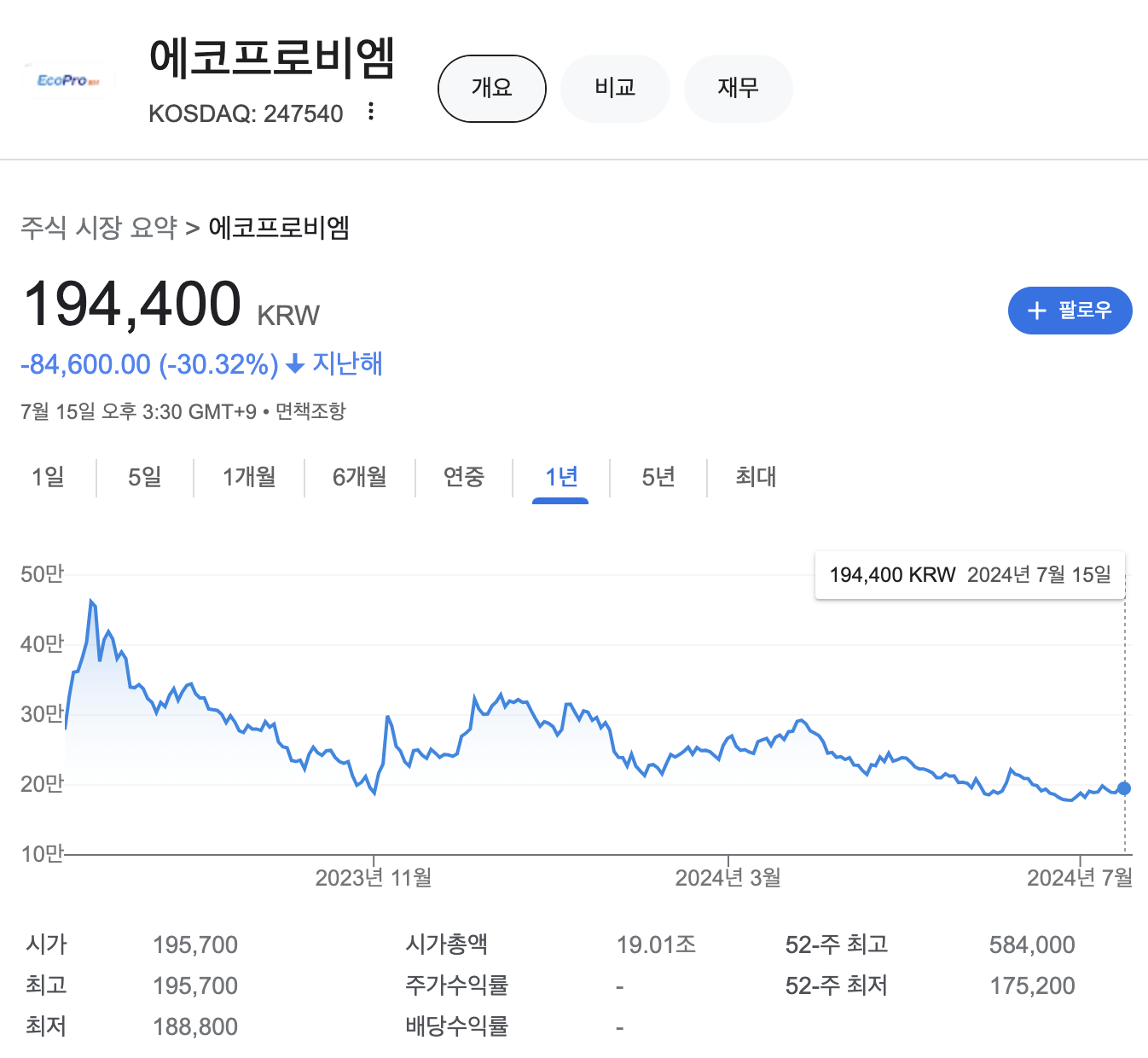에코프로비엠 주가는 지난해 1년 대비 -30.32% 하락해 있는 상태입니다.