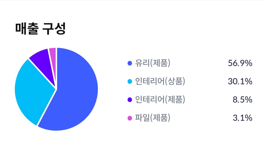 KCC글라스는 유리(제품) 56.9%, 인테리어(상품) 30.1%, 인테리어(제품), 8.5%, 파일(제품) 3.1%의 매출 구성을 하고 있습니다. 50%이상의 매출은 유리(제품)에서 발생하고 있습니다.